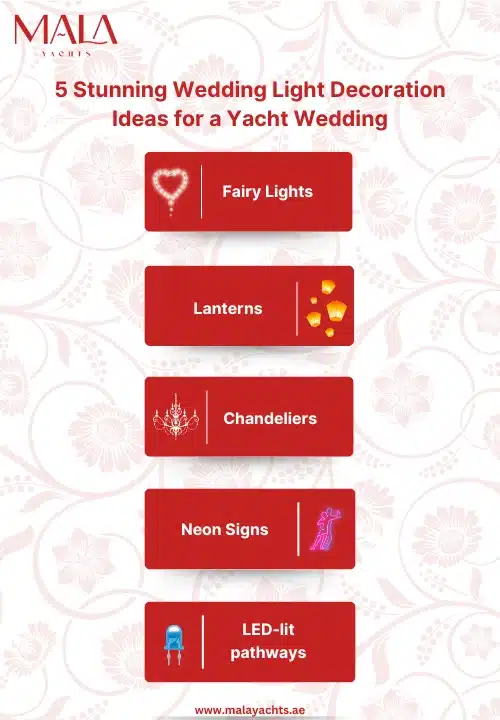– String Lights: This wedding light decoration can create a festive vibe. They can be hung in patterns or simply strung along the perimeter of the yachts