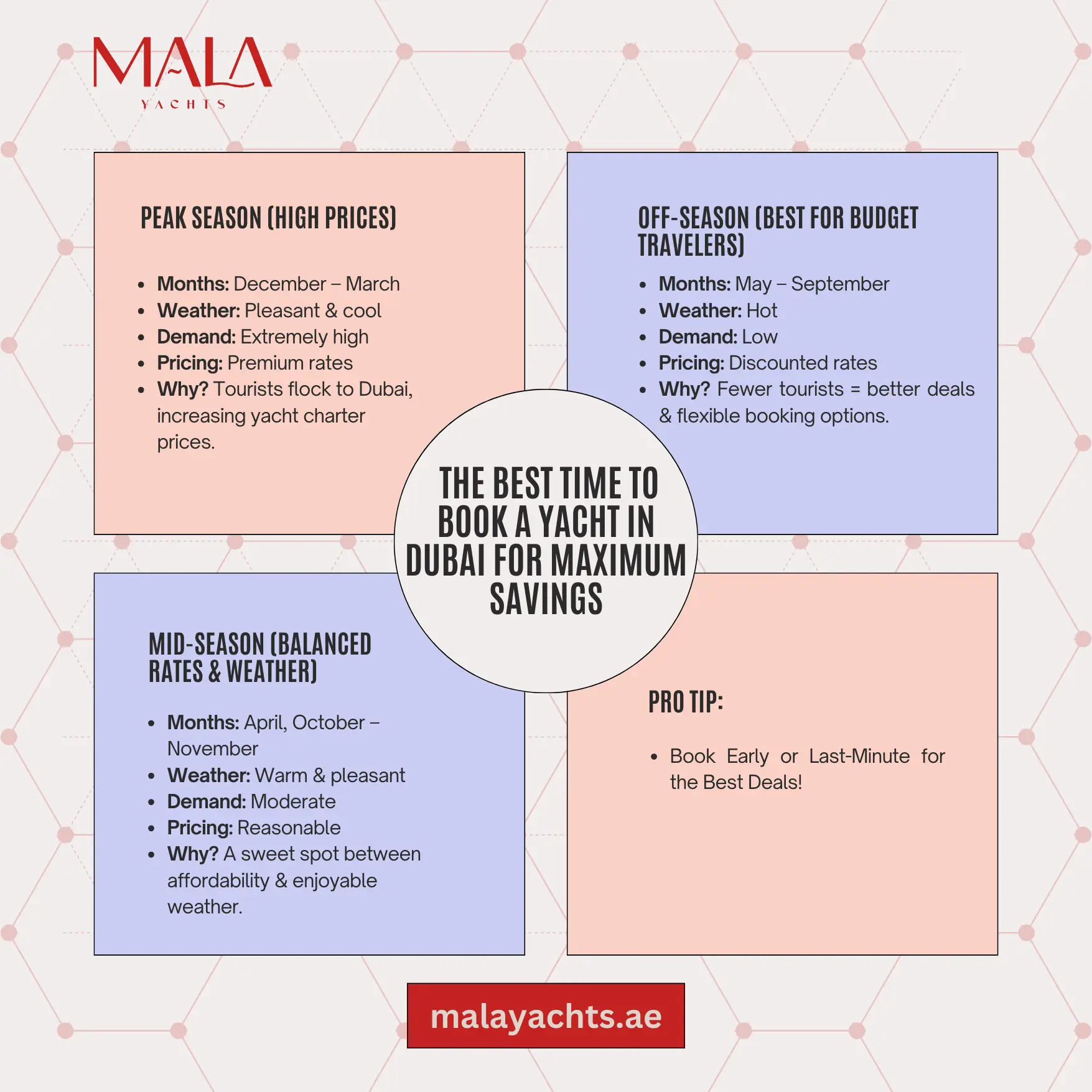 Dubai is one of the world’s most sought-after yacht charter destinations, but it’s also known for its tourist peaks – especially around major holidays or cooler months (December to March) During these busy times, yacht charter Dubai rates can soar.